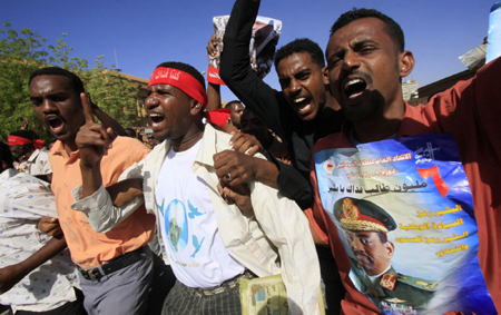 Supporters of Sudan's President Omar Hassan al-Bashir shout slogans during a demonstration in Khartoum, against the International Criminal Court (ICC) for issuing an arrest warrant for Bashir March 4, 2009. [Agencies]