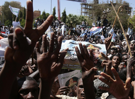 A crowd supporting Sudan's President Omar Hassan al-Bashir chant slogans during a protest against ICC's arrest warrant for al-Bashir in Khartoum March 5, 2009. [Agencies]