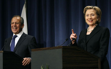 US Secretary of State Hillary Clinton (R) gestures next to Russia Foreign Minister Sergei Lavrov during a news conference after a bilateral meeting in Geneva March 6, 2009. [Agencies]