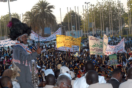 Sudan's President Omar Hassan al-Bashir speaks to the public in Khartoum, capital of Sudan, March 7, 2009.  [Xinhua]