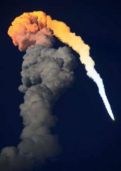 The shuttle rode into the clear sky trailing a column of pale smoke that turned into a knot of bright pink as it caught the light of the setting sun. Two and a half minutes into its climb to orbit the ship dropped its booster rockets, which could be seen drifting back to Earth as pinpoints of light against the darkening sky.