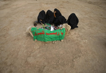 Women mourn as they sit next to a religious flag with the name of Zeinab, daughter of Imam Ali, as they visit a war memorial site near the Iraqi border, 1,365 km (854 miles) southwest of Tehran in Khoozestan province, March 16, 2009. [Agencies]