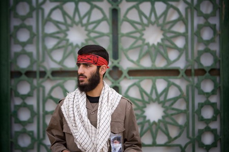 A member of Iran's basij militia hangs a photograph of Iran's Supreme Leader Ayatollah Ali Khamenei on his uniform, as he wears a religious headband with name of Imam Hussein, while standing in front of a mosque at a war memorial site near the Iraqi border, 1,365 km (854 miles) southwest of Tehran in Khoozestan province, March 16, 2009. [Agencies]