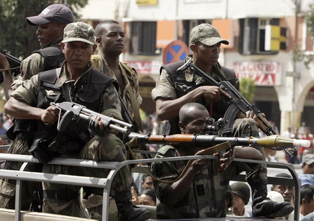 Madagascar's military drive through the streets of Antananarivo at the end of a rally organised by opposition leader Andry Rajoelina March 16, 2009. [Agencies]