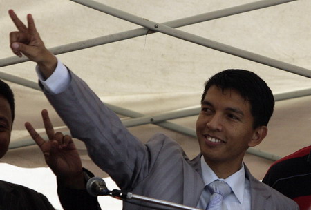Madagascar's opposition leader Andry Rajoelina greets his supporters during a rally in Antananarivo March 16, 2009. [Agencies]