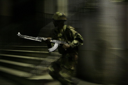 A soldier runs, after two tanks backed by troops forced their way into a presidential palace, in Antananarivo March 16, 2009. [Agencies]