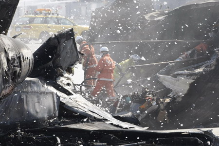 Emergency workers are seen at the site of a cargo plane crash at Narita international airport in Narita, east of Tokyo March 23, 2009. [Agencies]