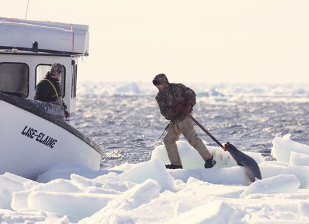 A sealer drags a dead harp seal to his boat during the annual seal hunt in Gulf of St. Lawrence March 25, 2009. [Agencies]
