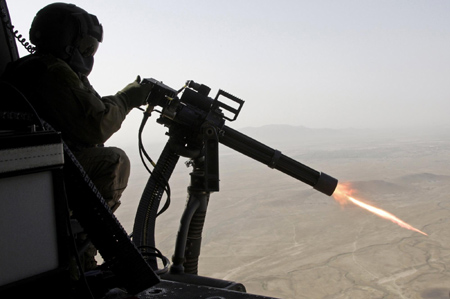 A Canadian soldier door gunner from NATO-led coalition, open fire with machine gun from CH-146 Griffon helicopter as they fly over neighbourhood in Kandahar province, southern Afghanistan, March 27, 2009. Helicopters are a prime asset to move NATO-led coalition troops and supplies in the war-plagued country because convoys by road are often blown up by improvised explosive devices (IEDs). [Agencies]