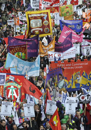 Demonstrators march through central London March 28, 2009. Thousands of demonstrators marched through London on Saturday to demand action on poverty, jobs and climate change at the start of a week of protests aimed at the G20 summit in the capital. [Agencies]