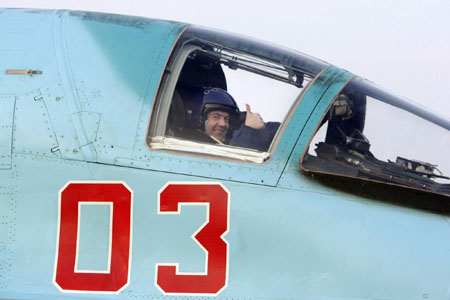 Updated: 2009-03-29 17:04 MOSCOW – Russian President Dmitry Medvedev Saturday made a 30-minute flight on Sukhoi-34 fighter-bomber, following an example set by his powerful predecessor Vladimir Putin.