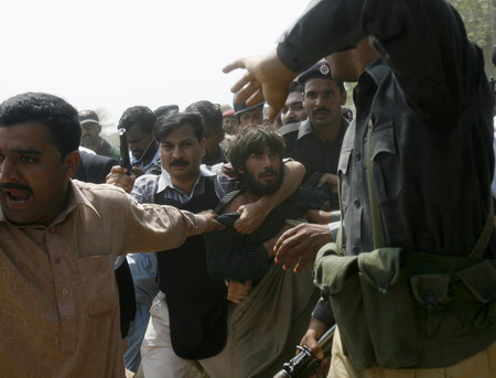 Police officials detain a suspected militant from the site of a shooting at a police training centre in Lahore March 30, 2009. [Agencies]