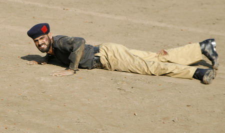 An injured policeman looks for assistance at the site of a shooting outside a police training centre in Lahore March 30, 2009. [Agencies]