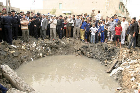 Residents and security personnel gather around a crater after a bomb attack in Baghdad's Sadr City, December 7, 2009. [Agencies]