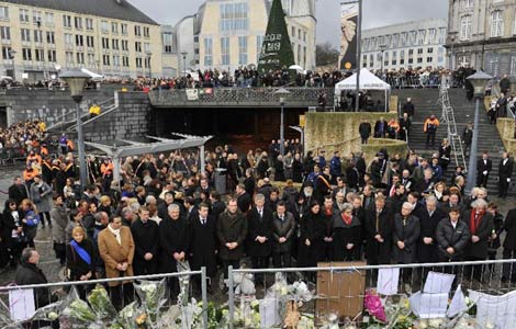 People give condolence during an official memorial service for the victims of a gun and grenade attack in Liege, Belgium, Dec 20, 2011. [Photo/Xinhua] |