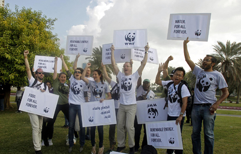 Local and foreign activists hold up a banner as they march to demand for action to address climate change in Doha Dec 1, 2012.
