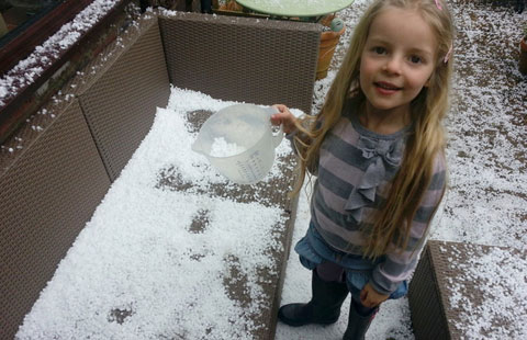 Winter made a brief return to Britain with a series of hailstorms and snow showers affecting parts of the country. In Devizes, Wiltshire a girl holds a cup of hail stones she collected after one storm, March 23, 2014. [Photo/icpress.cn]