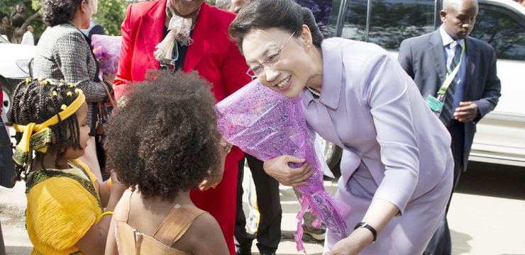 Cheng Hong, center, wife of Chinese Premier Li Keqiang, visits Addis Ababa University in Addis Ababa, Ethiopia, May 5, 2014.