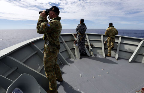 Divers embarked on Australian Defence Vessel Ocean Shield, scan the water for debris in the search zone in the southern Indian Ocean for the missing Malaysian Airlines flight MH370.