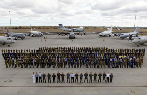 International and Royal Australian Air Force (RAAF) air crews and officials, that participated in the search for missing Malaysia Airlines plane MH370, pose for a photograph on the tarmac at the RAAF Base Pearce, located north of Perth.