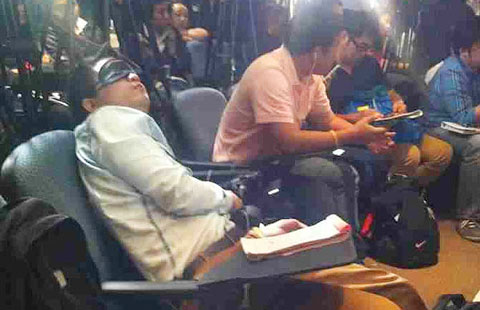 A reporter dozes off at the media center in Kuala Lumpur which was set up following the disappearance of the Malaysia Airlines aircraft, in this photo taken on March 14.
