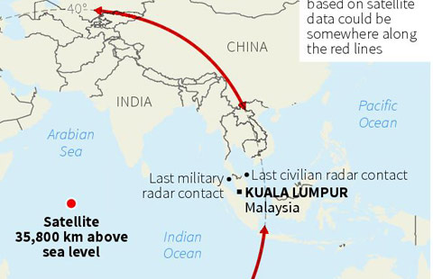 Map shows possible last known position of the missing Malaysia Airlines flight MH370 based on satellite data. 10 cm wide. Corrects typo in the satellite graphic