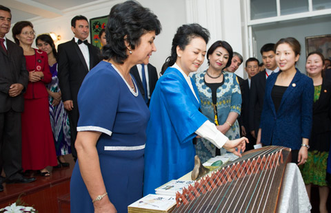 China's first lady Peng Liyuan demonstrates a guzheng, a traditional Chinese stringed instrument she donated to a Tajikistan music institute during her visit to Dushanbe on Friday.