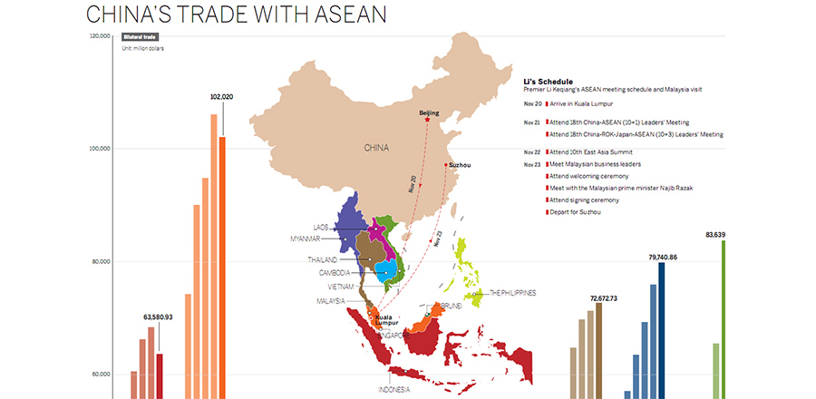 Editor's note: From poverty reduction and railway construction projects to political and trade cooperation, relations between China and the Association of Southeast Asian Nations have developed rapidly. China Daily looks back at the milestones along the road to regional prosperity as Premier Li Keqiang attends a series of meetings in Kuala Lumpur.