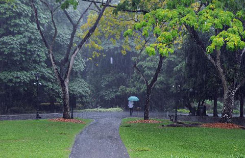 A visitor walks in rain in the Singapore Botanic Gardens, Nov 2, 2015.