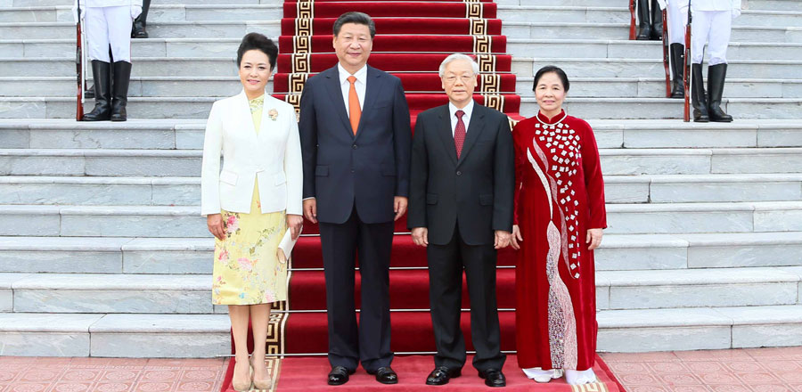 Chinese President Xi Jinping, who is also general secretary of the Communist Party of China (CPC) Central Committee, attends a welcoming ceremony held by General Secretary of the Communist Party of Vietnam Central Committee Nguyen Phu Trong before their talks in Hanoi, Vietnam, Nov. 5, 2015.