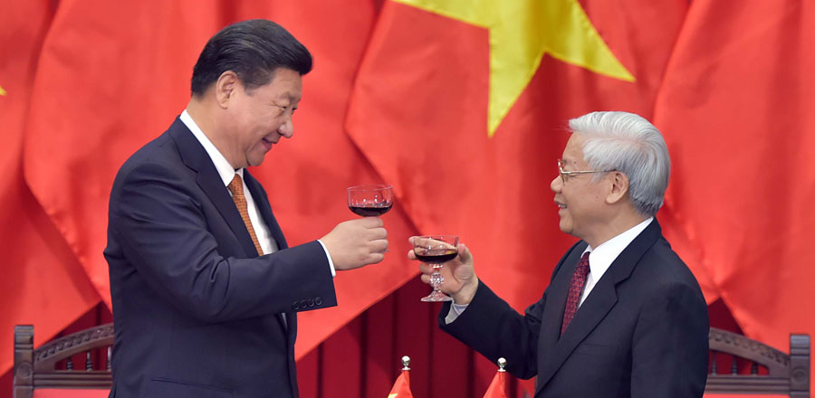 Chinese President Xi Jinping (L), who is also general secretary of the Communist Party of China (CPC) Central Committee, and General Secretary of the Communist Party of Vietnam Central Committee Nguyen Phu Trong attend the signing ceremony of bilateral cooperation documents after their talks in Hanoi, Vietnam, Nov. 5, 2015.