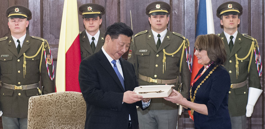 Visiting Chinese President Xi Jinping (L) is presented with the key of the city of Prague March 29, 2016.