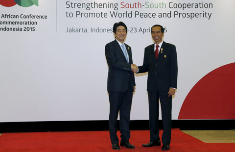 Japanese Prime Minister Shinzo Abe said on Wednesday that Japan, with feelings of deep remorse over the past war, made a pledge to adhere to the Bandung principles, which highlights peace and cooperation.
