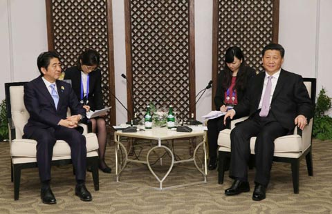 Chinese President Xi Jinping and Japanese Prime Minister Shinzo Abe held a meeting at the request of the Japanese side Wednesday.