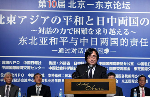 Yasushi Kudo, president of Japan's Genron NPO, a Japanese non-profit group, reads the Tokyo Consensus, a joint statement issued at the end of the 10th Beijing-Tokyo Forum, in Tokyo, Sept 29, 2014.