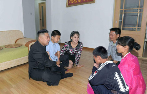 The Democratic People's Republic of Korea's top leader Kim Jong-un and his wife, Ri Sol-Ju, visit a family who moved into their new house in Pyongyang.