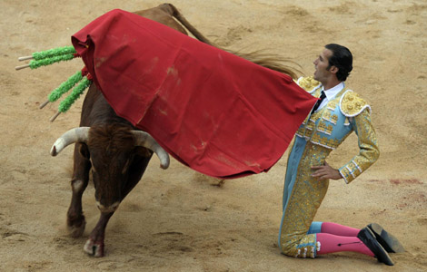 Assistant bullfighters wait for the start of the first bullfight of the San Fermin festival in Pamplona July 7, 2011.