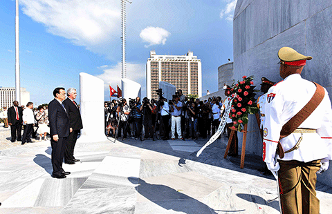 Chinese Premier Li Keqiang lays a wreath to the monument of Jose Marti, a Cuban national hero, in Havana, Cuba, Sept 24, 2016.