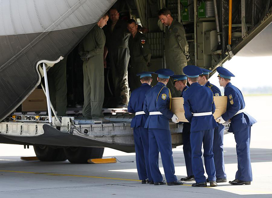 The first plane carrying the remains of victims of crashed Malaysia Airlines flight MH17 took off Wednesday from the eastern Ukrainian city of Kharkiv to the Netherlands.