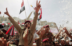 Protesters danced, sang and slaughtered cows in the central square of Yemen's capital Sunday to celebrate the departure of the country's authoritarian leader for medical treatment after he was wounded in a rocket attack on his compound.