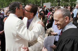 Thirty-six same-sex couples tied the knot Thursday at a high-profile public ceremony in Chicago's Millennium Park, a day after the newly-signed Illinois Religious Freedom Protection and Civil Union Act that allows such marriages became effective.