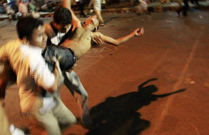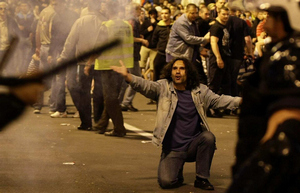 Protesters throwing stones and bottles clashed with baton-wielding riot police Sunday in Belgrade after several thousand Serbian nationalist supporters of jailed war-crimes suspect Ratko Mladic rallied outside the parliament building to demand his release.