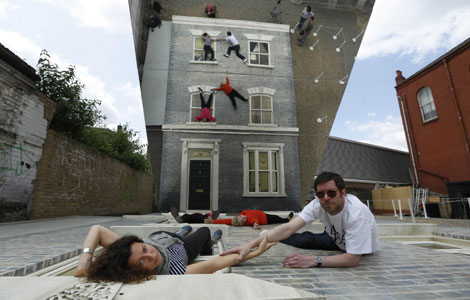 Visitors are seen by their reflections as they pose on Argentine artist Leonardo Erlich's optical illusion installation "Dalston House" in east London June 25, 2013.
