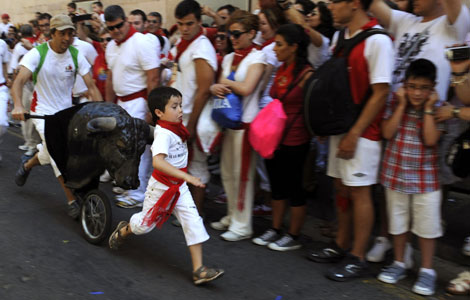 A group of runners fall in front of Victoriano del Rio fighting bulls and steers as they take the Estafeta curve during the fourth running of the bulls at the San Fermin festival.