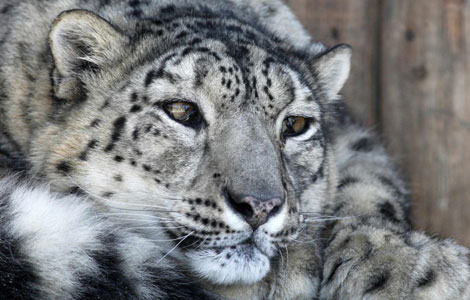 A female snow leopard, an endangered species, rests in an open air cage at the Royev Ruchey zoo in Russia