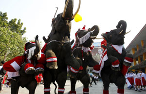 Elephants dressed as Santa Claus perform for students during Christmas celebrations at Jirasart school in Ayutthaya, 70 km (44 miles) north of Bangkok, Dec 24, 2010.