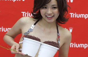 A model wears Triumph International's "Grow-Your-Own-Rice bra" in Tokyo May 12, 2010. The bra, which transforms into a rice growing kit, allows the wearer to cultivate rice anytime, anywhere.
