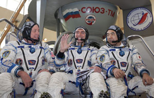 Japanese astronaut Satoshi Furukawa (L) and US astronaut Michael E. Fossum take part in an exam on a simulator of the International Space Station in the Russian cosmonaut training centre at Star City outside Moscow May 12, 2011. The three-man team is scheduled to leave for the International Space Station on June 7.