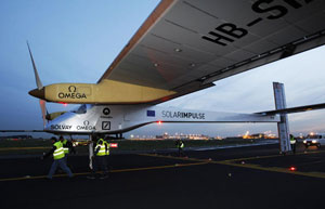 The solar-powered HB-SIA prototype flown by Solar Impulse's Chief Executive Officer and pilot Andre Borschberg, lands at Zaventem's international airport near Brussels May 13, 2011. The plane made its first international trip.