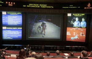 After 257 days in a locked, windowless steel capsule, researchers on a mock trip to Mars ventured from their cramped quarters in heavy space suits Monday, trudging into a sand-covered room to plant flags on a simulated Red Planet.